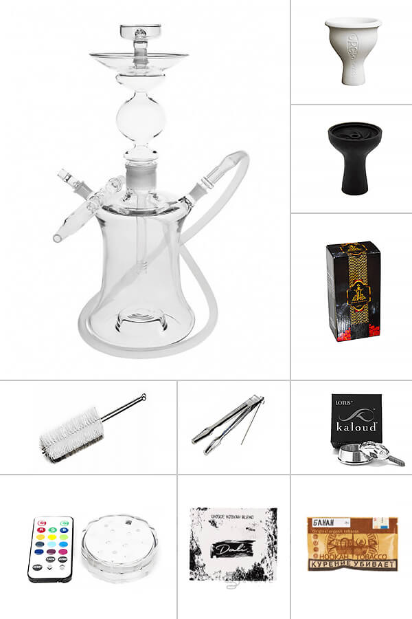 В набор входит непосредственно сам кальян с силиконовым шлангом и разноцветной подсветкой с пультом дистанционного управления для создания неповторимой атмосферы. Чтобы суметь понять свои предпочтения относительно чаш, в комплекте есть силиконовая и глиняная чаши. Набор табаков, уголь, щипцы с дыроколом и значительно упрощающий жизнь калауд — необходимые составляющие премиального набора, обеспечивающие качественное и комфортное курение. Ну и, наконец, ерш для колбы, который просто обязателен для хорошего ухода за этим кальяном.