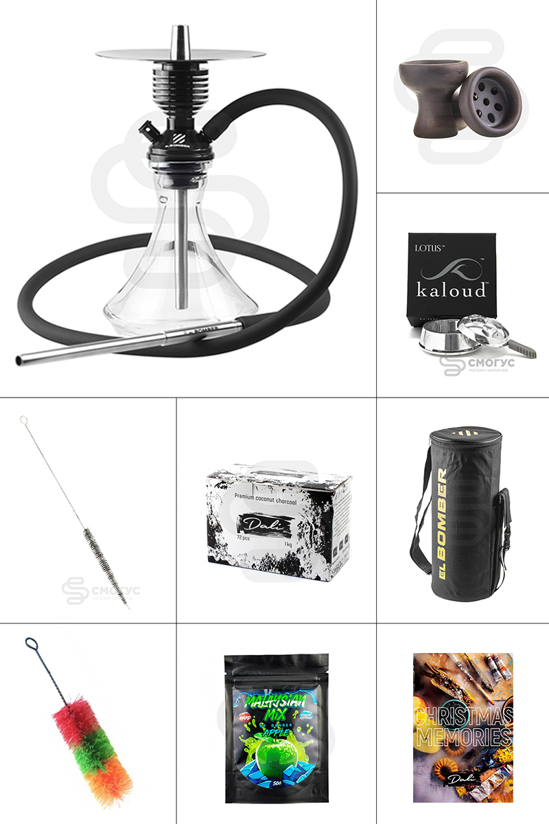 Набор для настоящих ценителей хорошего отдыха. В комплекте лишь самое необходимое, забивайте, приглашайте друзей и курите! В набор входит: компактный кальян El Bomber в базовой комплектации (шахта, колба, шланг, мундштук, уплотнители). Его высота в сборе составляет всего 40 сантиметров, что является важной особенностью при перевозке и хранении. Кстати, в комплекте с ним идет фирменная сумка, в которой все продуманно до мелочей!
