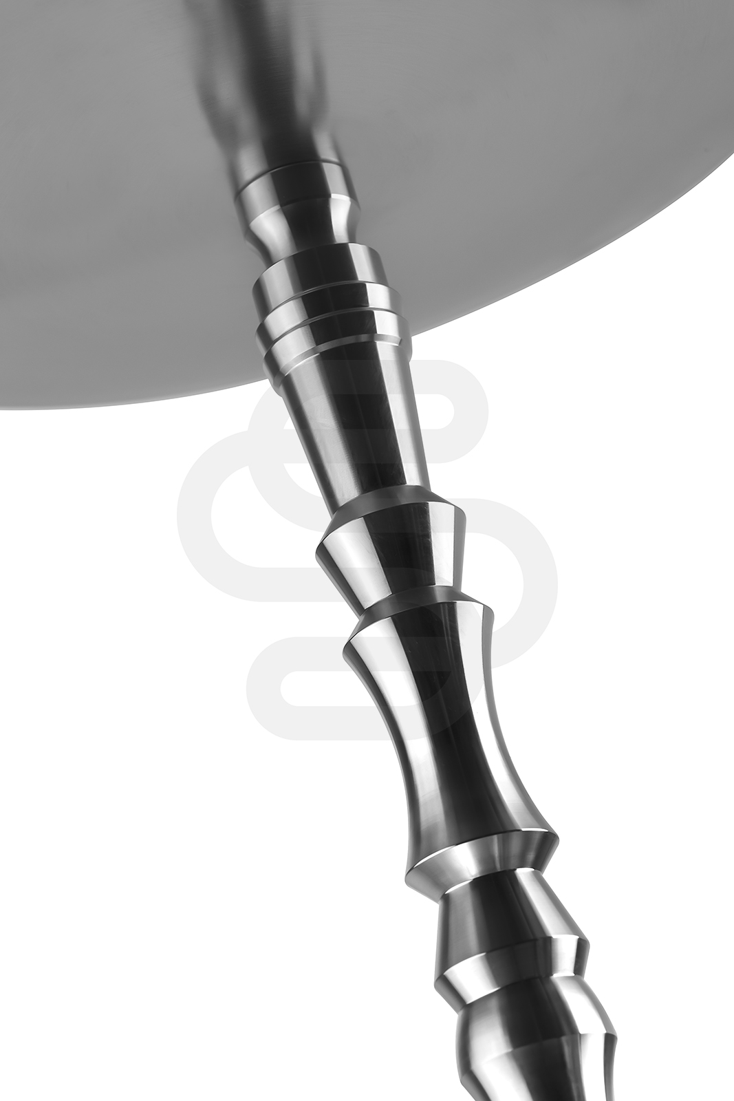 Шахта полностью разборная и имеет простое соединение на притирке и o-ringe с колбой. Также на притирке подсоединяются блюдце и коннектор для шланга. Благодаря такому коннектору шланг не изнашивается и отсутствуют переломы у основания. Основание шахты 14 мм, что дает классическую тягу, который можно регулировать при помощи съемного диффузора.