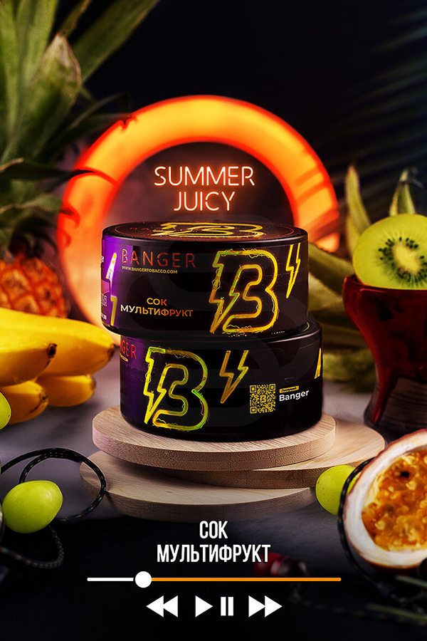 Banger Summer Juicy (Сок мультифрукт) – яркий аромат кисло-сладкого микса тропических и цитрусовых фруктов.
