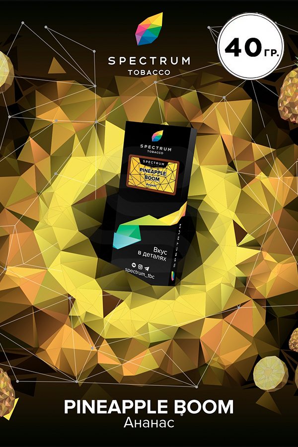 Spectrum Hard Pineapple Boom (Ананас) — жаркий летний вкус спелого ананаса, безумно солнечного и вкусного. Насыщенная кислинка динамично перетекает в манящую, натуральную сладость плода. Вполне классический вкус, который с первого же вдоха покоряет своей натуральностью.