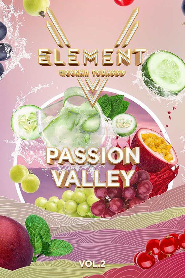 V Element Passion Valley (Огуречный лимонад, маракуйя, смородина, виноград) – неповторимый микс, который с первых же минут зарядит вас свежестью. Ароматный огуречный лимонад смешан с легкими тропическими нотками маракуйи, а также кисленькой смородиной и виноградом.Вкус понравится любителям ягодных табаков.